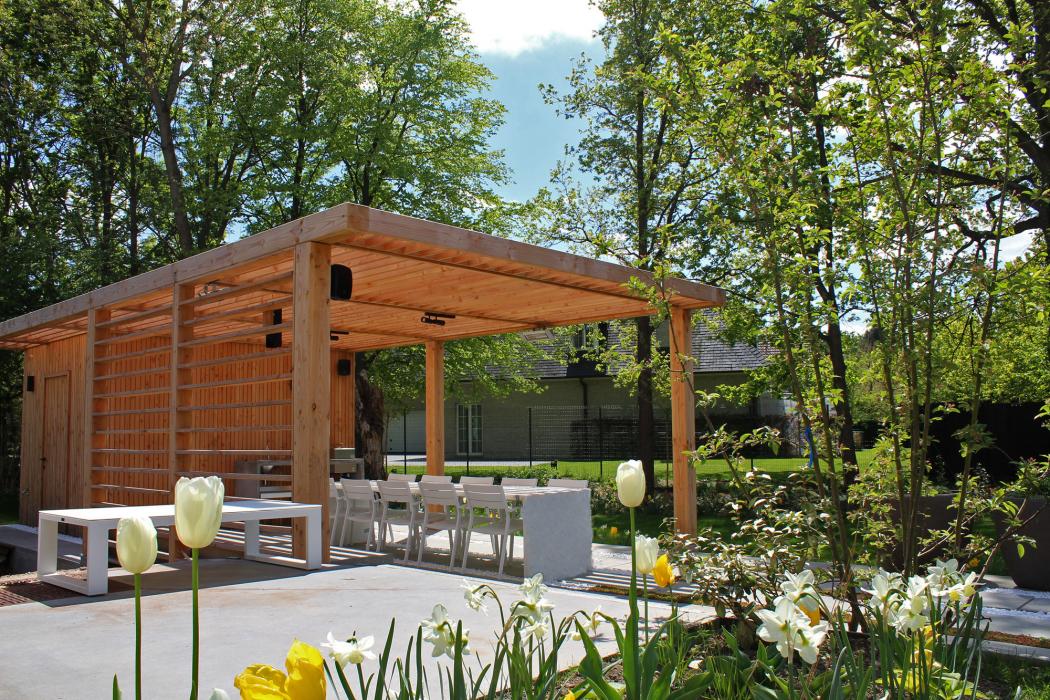 Een tuinhuis, buitenkeuken en zitplaats worden samengebracht onder de pergola.